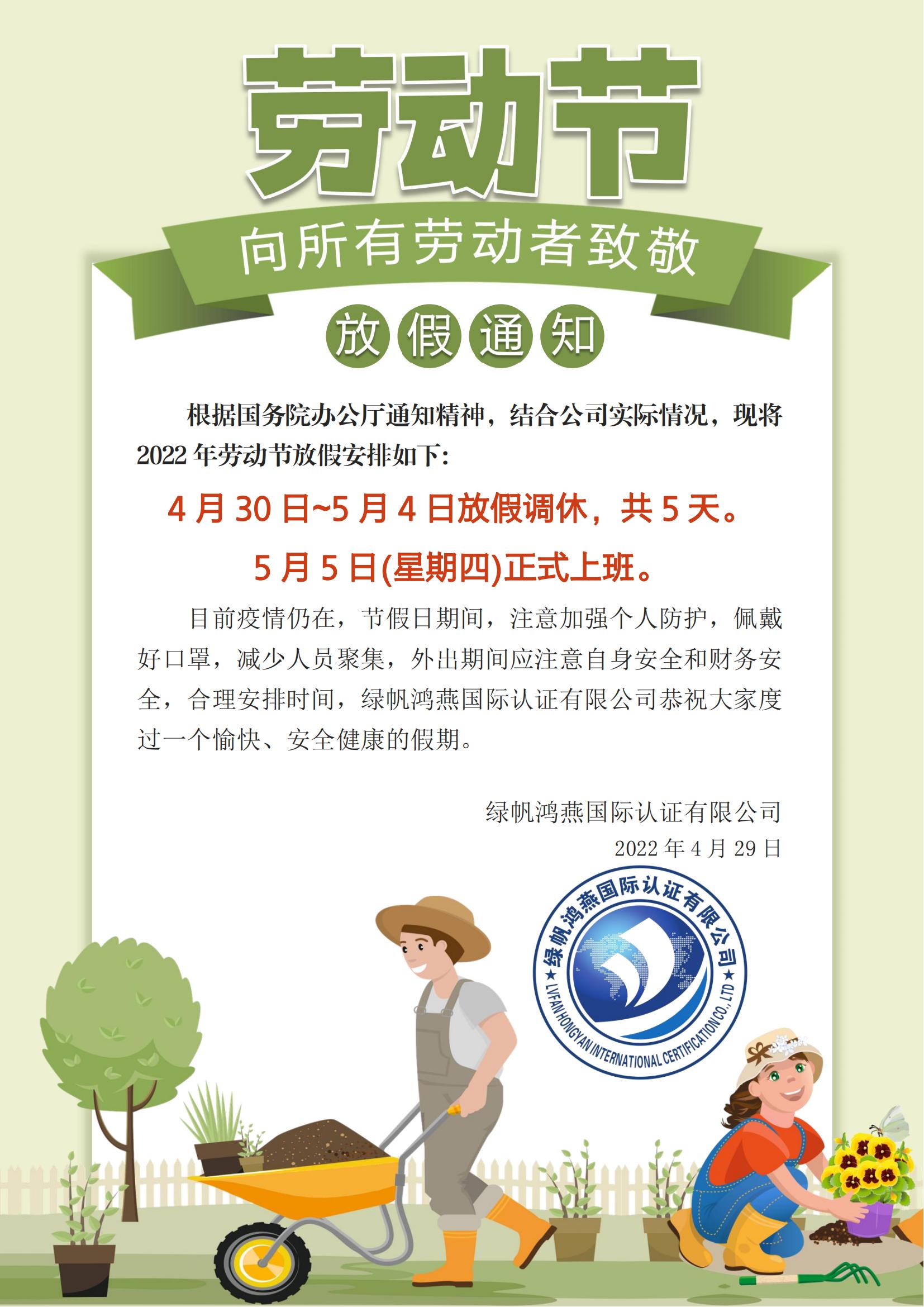 綠帆鴻燕國際認證有限公司五一勞動節放假的通知